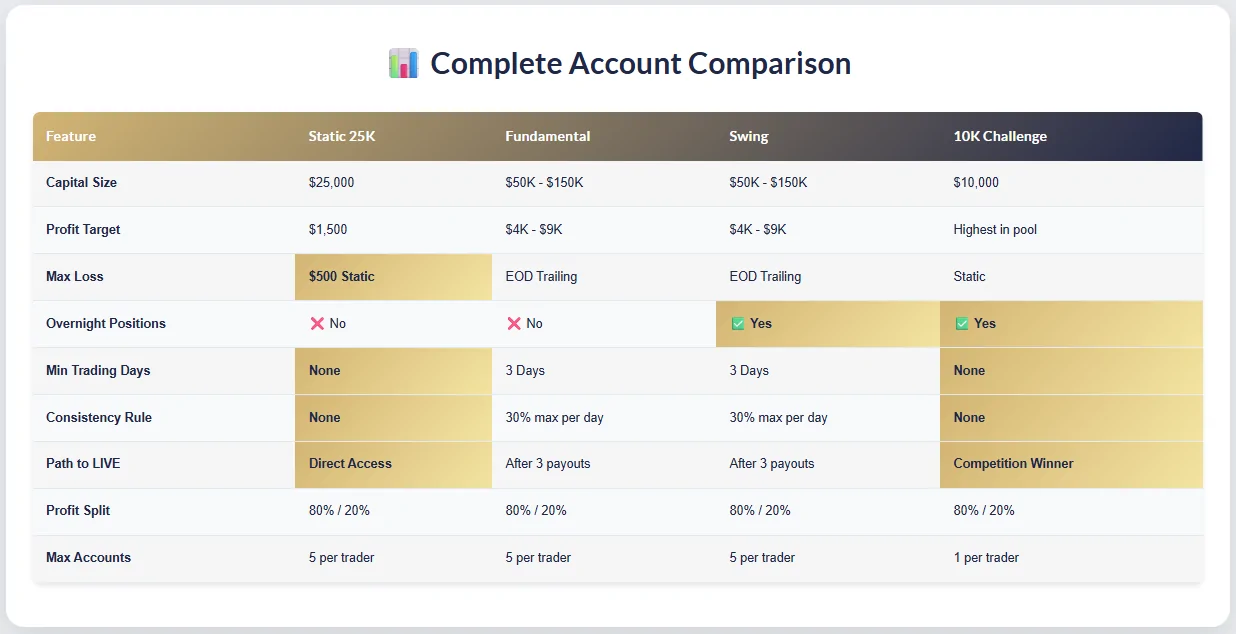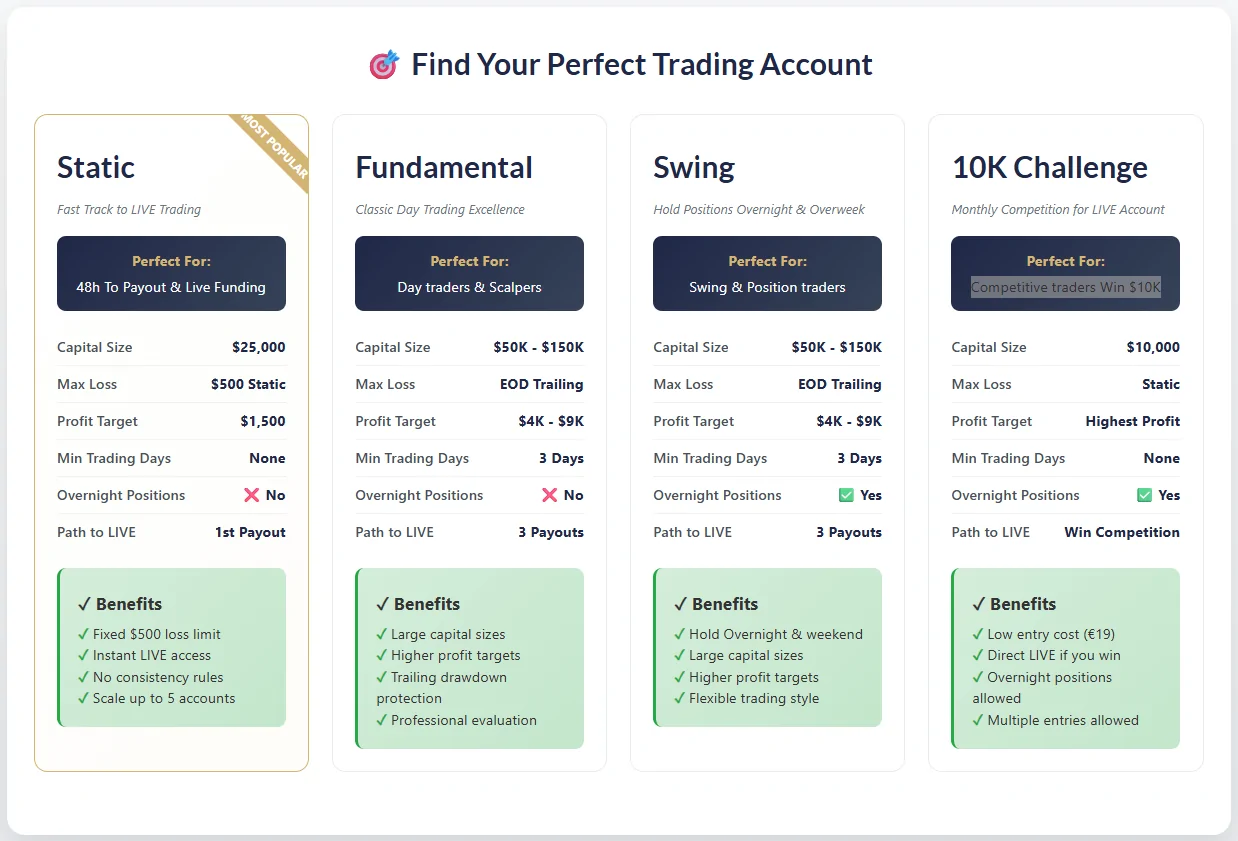 • Flexible Account Options: Choose between Static, Fundamental, Swing, or 10K Challenge accounts.