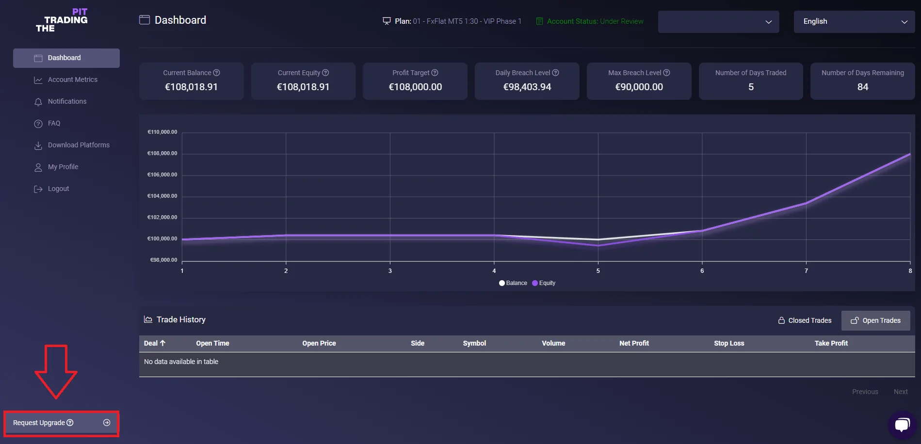 After reaching the profit target and completing the minimum trading days, a new option will show up at the bottom left of your Dashboard, “Request Upgrade”. After clicking this, our team will start the upgrade process. Please note this may take from 1-3 working days, and you will be kept fully updated via email.