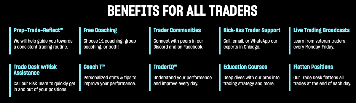 This includes daily live trading classes, profit targets, trading psychology lessons, private trader group chats, and watching professionals trade in real-time during their live broadcasts.